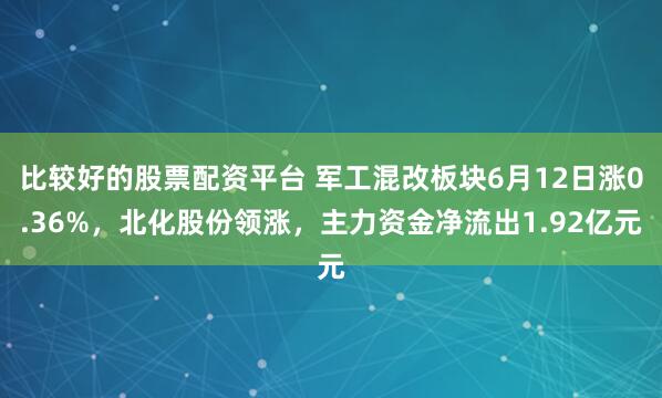 本站消息,6月12日军工混改板块较上一交易日上涨0.36%,北化股份领涨。当日上证指数报收于3402.66比较好的股票配资平台,上涨0.01%。深证成指报收于10234.33,下跌0.11%。军工混改板块个股涨跌见下表: